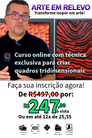 O Arte em Relevo é um curso 100% online criado por Dario Martins, artista e professor com mais de 20 anos de experiência, que ensina passo a passo como criar quadros com textura e profundidade 3D, usando isopor modelado, massa artesanal, pintura artística e acabamento com moldura rústica.